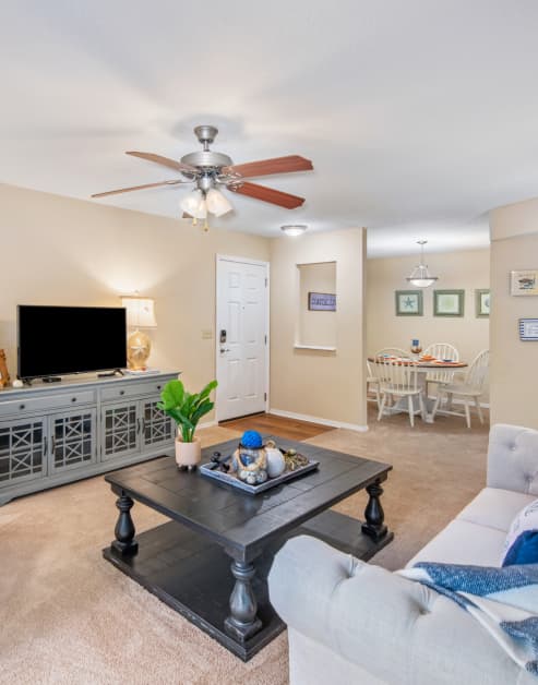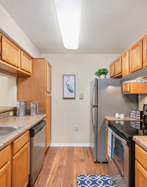 We are proud to offer some of the largest floor plans in the area for our one-, two-, and three-bedroom apartment homes. Every unit offers walk-in closets, full-size washer and dryer, and smart home technology. The stylish kitchens feature stainless steel appliances and elegant vinyl wood flooring, making everyday cooking or entertaining guests a pleasure. You can retreat to your relaxing bathroom, which includes a double vanity and your choice of a soothing garden tub or a convenient shower. Plus, enjoy fresh air year-round on your private screened patio or balcony, or unwind in front of the cozy wood-burning fireplace. Garages are also available.