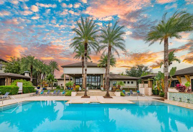 Enjoy resort-style luxuries like EV charging stations and all the comforts of home at MAA Crosswater in Orlando. Garden-style tubs, double vanity sinks, a smart home system, and washers/dryers are featured in all apartments for rent. Outside, you can swim in the gorgeous swimming pool and enjoy the fireplace pavilion on a cooler night. Work out in our fitness center and watch your dog run in the dedicated dog park welcoming all breeds. Best of all, you can see Disney fireworks from the community!