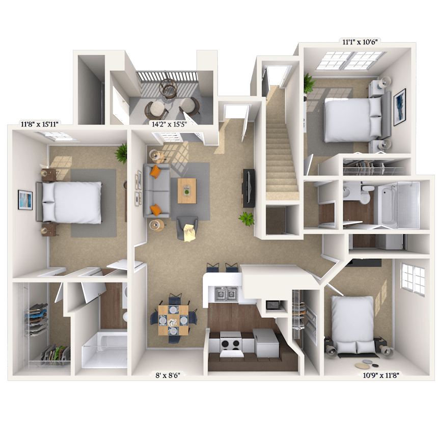Our one-, two-, and three-bedroom apartments offer large bedrooms with plenty of room to relax and recharge, as well as generous walk-in closets to keep everything organized. You’ll love the convenience of the in-unit washer and dryer setups. The kitchen is designed to be as functional as it is stylish, featuring laminate countertops, sleek stainless-steel appliances, and a cozy breakfast nook where you can enjoy your morning coffee. Whether you're cooking for one or entertaining guests, you'll love the layout. Our bathrooms are equally impressive with a tub-shower combo and crisp white cabinets, offering a clean and inviting space to unwind. Select homes have added touches like high ceilings, wood plank flooring, screened porches, patios, or balconies, ensuring you have the perfect space to call home. Detached garages are also available.