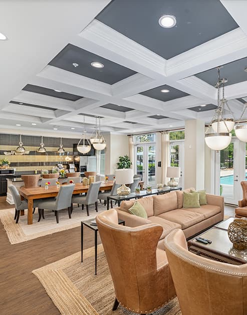 Appreciate a hot summer day swim in our sparkling saltwater swimming pool or soak up rays on the expansive sundeck. Hold a cookout at our poolside outdoor kitchen and grill station. Enjoy outdoor games on our event lawn, which also features a firepit for the cooler months. Work out at your convenience with our 24-hour fitness center. Gather some friends for a game of billiards or shuffleboard. Let your dog, of any size or breed, romp off the leash in the enclosed dog park at our pet-friendly community. Private garages are available, too.