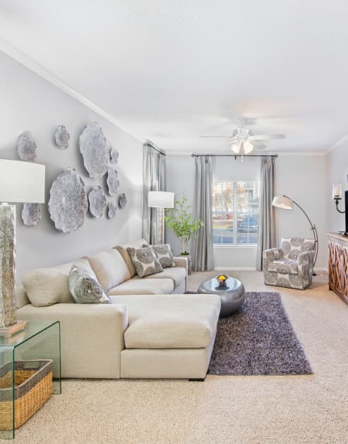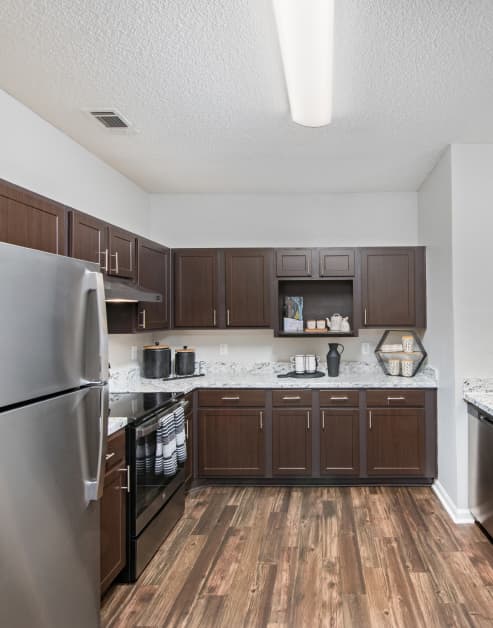 Our custom interiors include stainless steel appliances, Jacuzzi tubs, and oversized closets. Choose from one-bedroom, two-bedroom, and three-bedroom apartments with smart home technology and the convenience of an in-unit washer/dryer in our gated community. Select apartments also boast high ceilings, cozy fireplaces, sunrooms, and more.