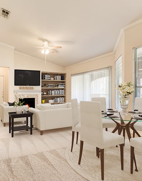 The one-bedroom, two-bedroom, and three-bedroom apartments for rent at MAA Bear Creek offer an in- unit washer and dryer and elegant details like crown molding and bedroom ceiling fans for added comfort. The kitchens are designed for both function and style, offering upgraded cabinetry, granite or laminate countertops, a built-in microwave, and stainless-steel appliances, with select homes featuring a kitchen island for more prep space. Bathrooms provide a spa-like retreat with a garden tub or shower and dual vanities for added luxury. Plus, select homes also include private patios, cozy wood-burning fireplaces, built-in bookshelves, and vaulted ceilings. Additional storage and attached garages are available.