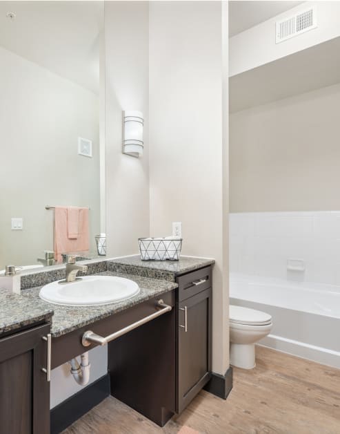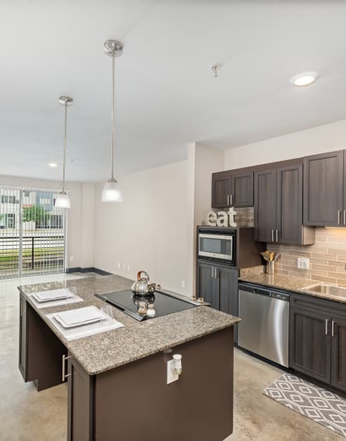Many of our well-appointed studio, one-bedroom, and two-bedroom apartment homes have an open loft-style feel with exposed ducts, concrete floors, and granite countertops. Enjoy the abundance of natural light streaming through full-length windows, and savor the convenience of walk-in closets, smart home technology, and modern appliances. Select apartments boast fireplaces, patios, balconies, kitchen and bath upgrades, and super ceilings.[9][10][11] Plus, you can use our EV charging stations for your vehicle. Secure garage parking is available.