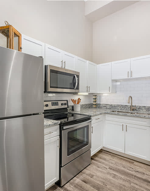 MAA Legacy offers luxury studio, one-bedroom, and two-bedroom apartments and townhomes. Every home includes walk-in closets, an in-unit washer and dryer, and bedroom ceiling fans that add extra comfort year-round. You will love cooking and entertaining in our gourmet kitchens that boasts stainless steel appliances, backsplashes, and kitchen islands. Choose from either espresso or white cabinetry, complemented by granite or tan countertops. Bathrooms feature double vanities and offer a choice of a deep garden tub, glass shower, or a tub-shower combo for a spa-like experience. For those who love unique touches, select homes include vaulted ceilings, French doors, built-in bookshelves, exposed ductwork, hardwood or stained concrete flooring, and crown molding. You can even snuggle up by your own wood-burning fireplace in some units. Outdoor spaces range from patios and balconies—including rare double balconies—to fenced backyards and front porches, offering plenty of ways to enjoy fresh air. Reserved parking and attached garages are also available for added convenience.