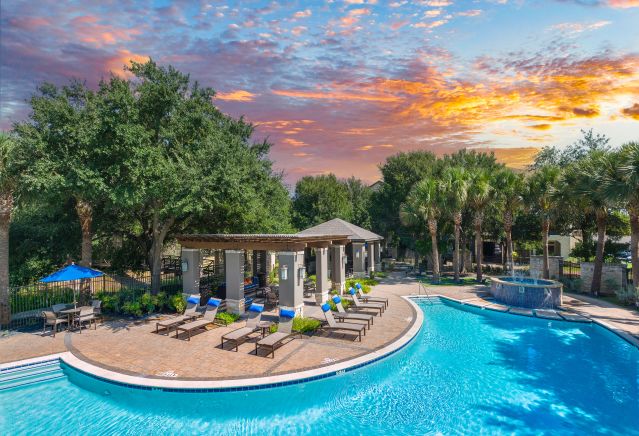 The spacious fitness center is open night and day to fit your schedule. On those scorching Texas afternoons, take a refreshing dip in our resort-style pool, the ideal spot for cooling off and soaking up some sun. For outdoor gatherings, our BBQ area is nestled in the shade beneath a poolside cabana. As the sun sets and temperatures drop, gather around the fireplace for a cozy evening with friends and family. We offer flexible pet policies with no breed or weight restrictions and our dedicated Bark Park provides a fun space for your furry friends to romp and play. Inside, you'll find even more convenience with our coffee bar, business center, conference room, and media lounge.
